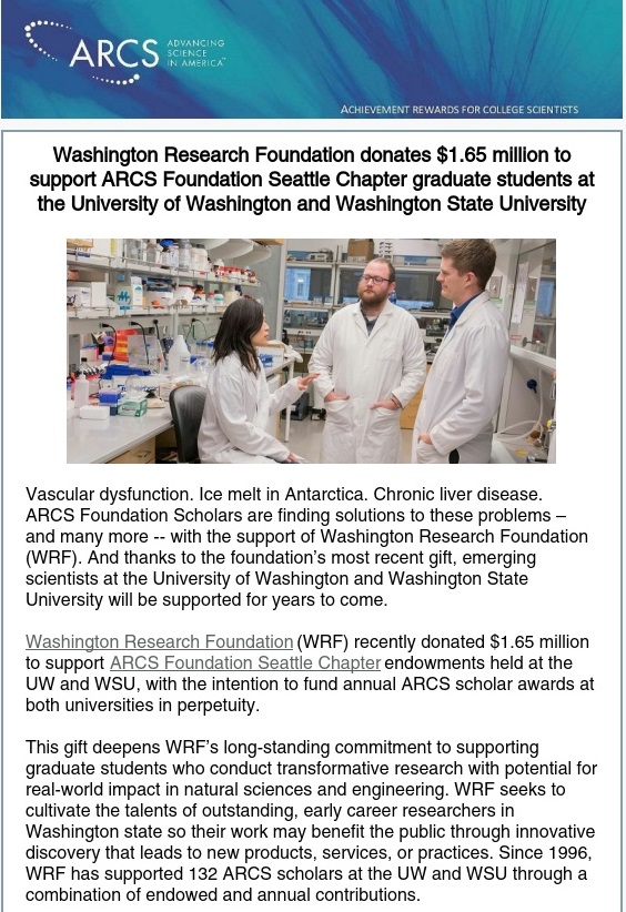 Washington Research Foundation (WRF) recently donated $1.65 million to support ARCS Foundation Seattle Chapter endowments held at the UW and WSU, with the intention to fund annual ARCS scholar awards at both universities in perpetuity.