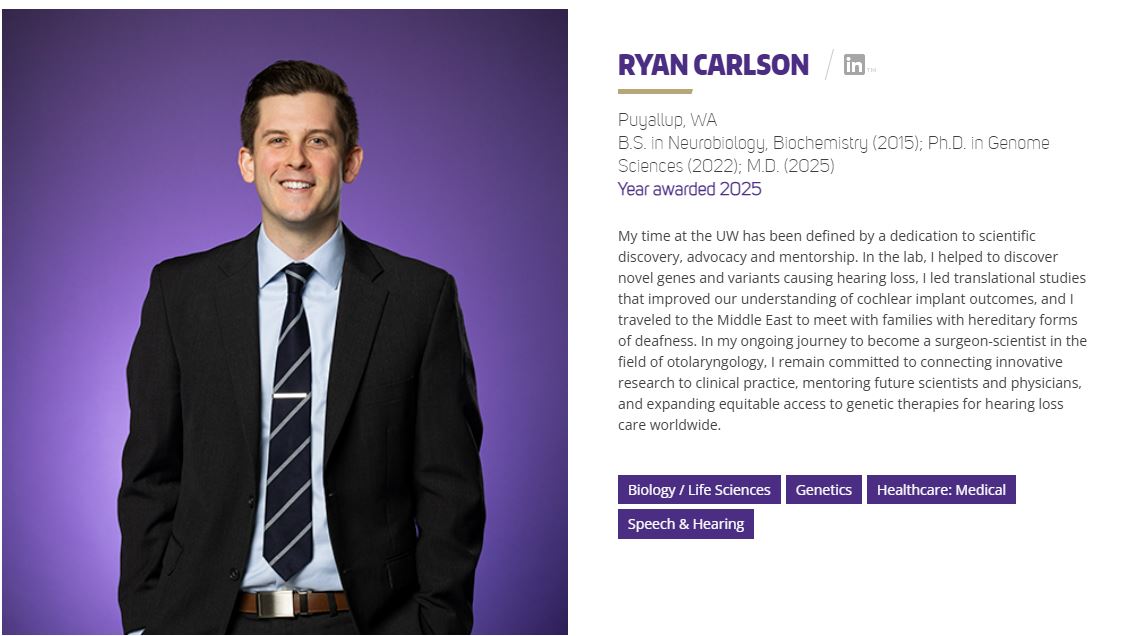 Congratulations to Ryan Carlson MD/PhD, Genome Sciences, 2018-2021 Althea Stroum ARCS Endowment Fellow (28th) announced as one of this year’s University of Washington Husky 100. For the past 10 years, this program has recognized the outstanding work and achievements of students on all three University of Washington campuses who are making the most of their Husky Experience.